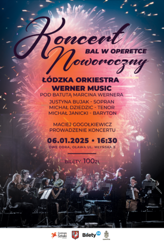 Od 10 lat Centrum Sztuki w Oławie w pierwszych dniach stycznia klasycznie i z klasą rozpoczyna kulturalny rok kalendarzowy. Koncert jest wzorowany na słynnych koncertach noworocznych Filharmoników Wiedeńskich, a podczas występu wykonywane są popularne walce wiedeńskie i inne karnawałowe utwory. Tym razem usłyszymy je w wykonaniu Łódzkiej Orkiestry Werner Music pod batutą Marcina Wernera z towarzyszeniem solistów: Justyny Bujak – sopran, Michała Dziedzica – tenor i Michała Janickiego – baryton. Koncert poprowadzi Maciej Gogołkiewicz.